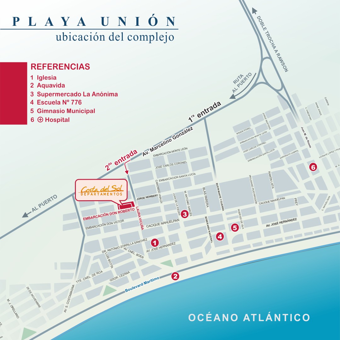Ubicación Ubicación Nuestros departamentos se ubican en Playa Unión, Chubut, Patagonia Argentina, a escasos metros del bello Océano Atlántico. La dirección es Embarcación Don Roberto 1367. Para más referencias, puede consultar los mapas interactivos: Google StreetView de 2014: Descargables para imprimir: JPG PDF Otros mapas: Bing maps Open Street Maps Skip back to main navigation